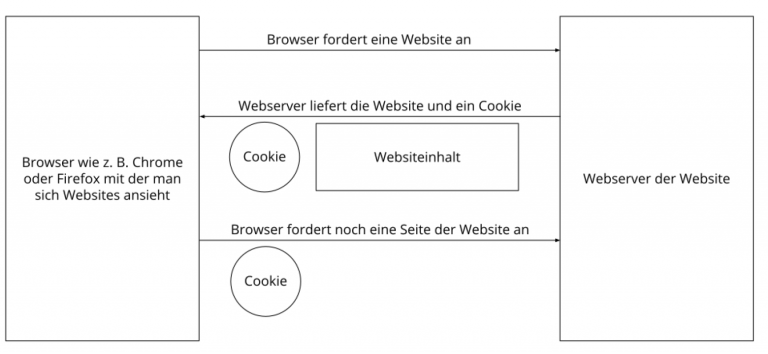 Die folgende Grafik zeigt eine mögliche Interaktion zwischen einem Webbrowser wie z. B. Chrome und dem Webserver. Dabei fordert der Webbrowser eine Website an und erhält vom Server ein Cookie zurück, welches der Browser erneut verwendet, sobald eine andere Seite angefordert wird.