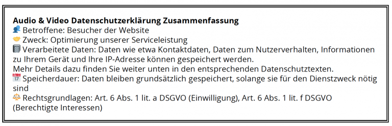 Wenn Sie eingewilligt haben, dass Daten von Ihnen durch eingebundene Audio- und Video- Elemente verarbeitet und gespeichert werden können, gilt diese Einwilligung als Rechtsgrundlage der Datenverarbeitung (Art. 6 Abs. 1 lit. a DSGVO). Grundsätzlich werden Ihre Daten auch auf Grundlage unseres berechtigten Interesses (Art. 6 Abs. 1 lit. f DSGVO) an einer schnellen und guten Kommunikation mit Ihnen oder anderen Kunden und Geschäftspartnern gespeichert und verarbeitet. Wir setzen die eingebundenen Audio- und Video-Elemente gleichwohl nur ein, soweit Sie eine Einwilligung erteilt haben.