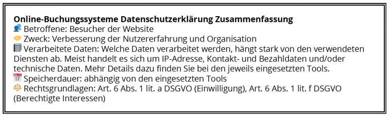 Welche Daten genau verarbeitet werden, können wir Ihnen in diesem allgemeinen Informationstext über Buchungssystem natürlich nicht sagen. Das ist stets vom verwendeten Tool und den darin enthaltenen Funktionen und Möglichkeiten abhängig. Viele Buchungssysteme bieten neben der herkömmlichen Buchungsfunktion auch noch eine Reihe an weiteren Features an. So haben beispielsweise viele Systeme auch ein externes Online-Zahlsystem (z. B. von Stripe, Klarna oder Paypal) und eine Kalender-Synchronisierungsfunktion integriert. Dementsprechend können je nach Funktionen unterschiedliche und unterschiedlich viele Daten verarbeitet werden. Für gewöhnlich werden Daten wie IP-Adresse, Name und Kontaktdaten, technische Angaben zu Ihrem Gerät und Zeitpunkt einer Buchung verarbeitet. Wenn Sie im System auch eine Zahlung vornehmen, werden auch Bankdaten wie Kontonummer, Kreditkartennummer, Passwörter, TANs usw. gespeichert und an den jeweiligen Zahlungsanbieter weitergegeben. Wir empfehlen Ihnen die jeweilige Datenschutzerklärung des verwendeten Tools genau durchzulesen, damit Sie wissen, welche Daten von Ihnen konkret verarbeitet werden.